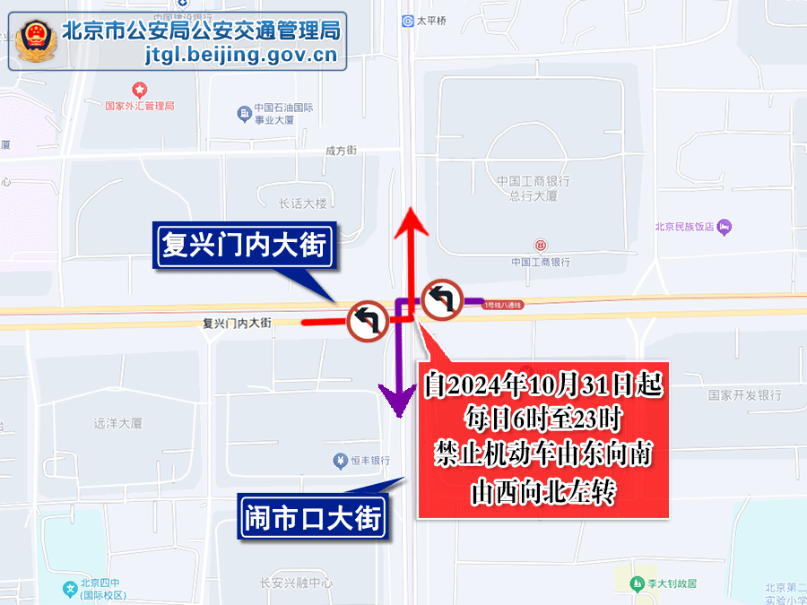 【关于调整北京部分路口交通管理措施的通告】为保证本市部分路口的交通安全顺畅,根据道路交通安全法律法规有关规定,决定自2024年10月31日起,复兴门内大街与闹市口大街交叉口、建国门内大街与北京站街交叉口禁止机动车由东向南、由西向北左转时间,由“每日6时至9时、16时至20时”调整为“每日6时至23时”。